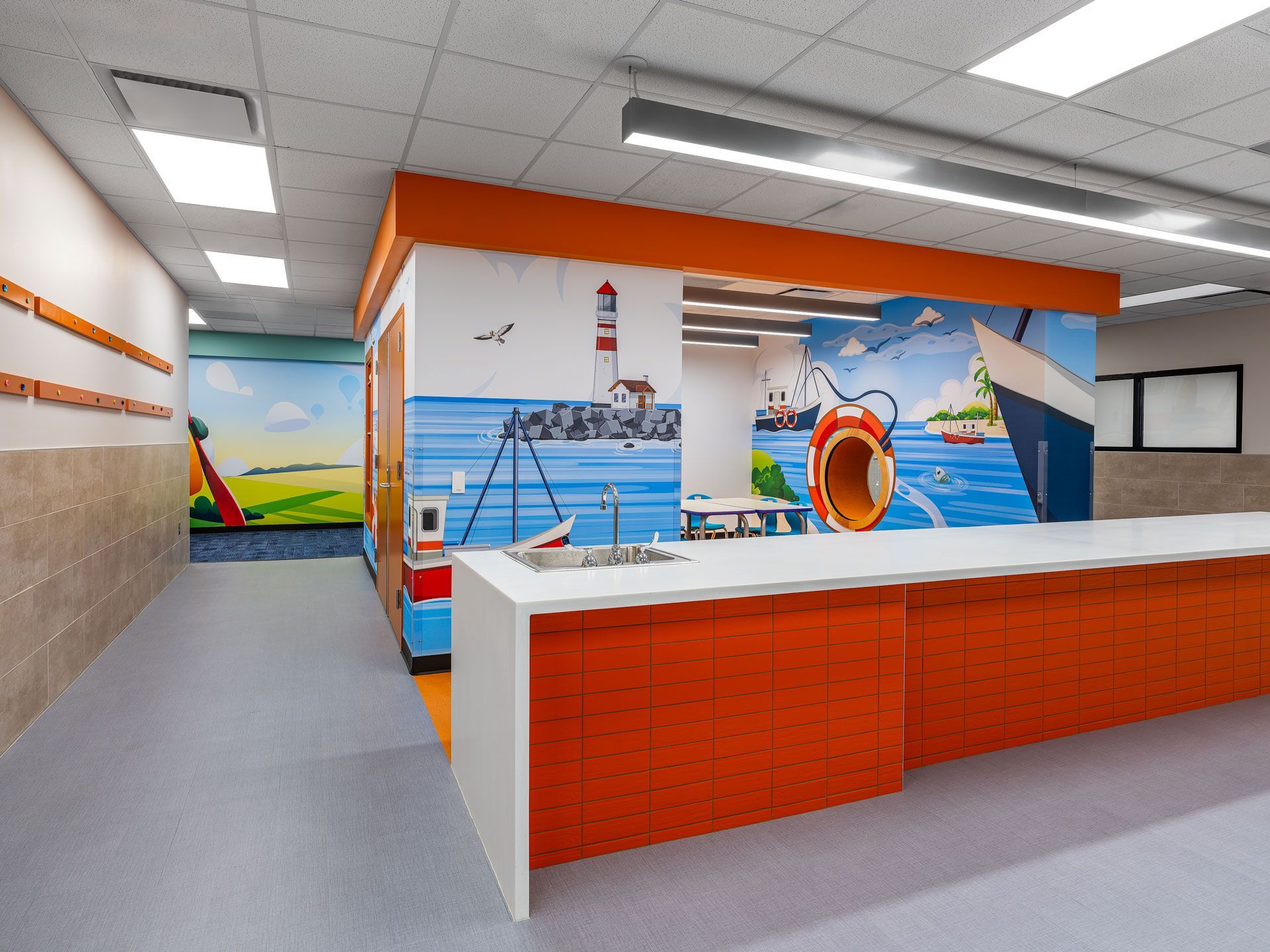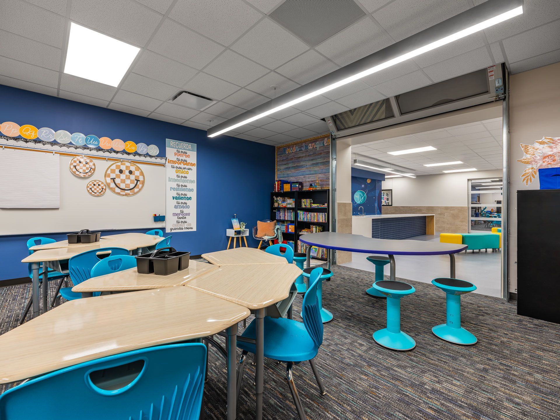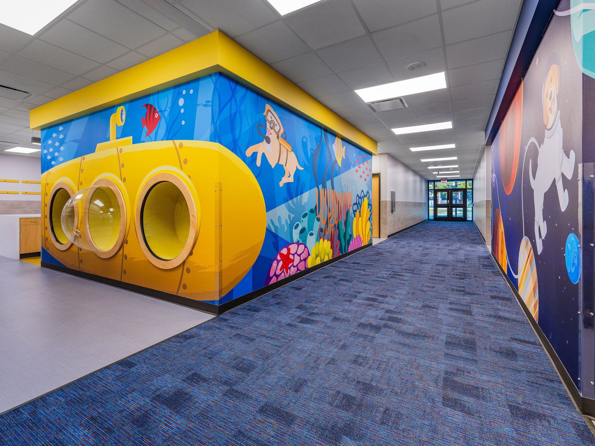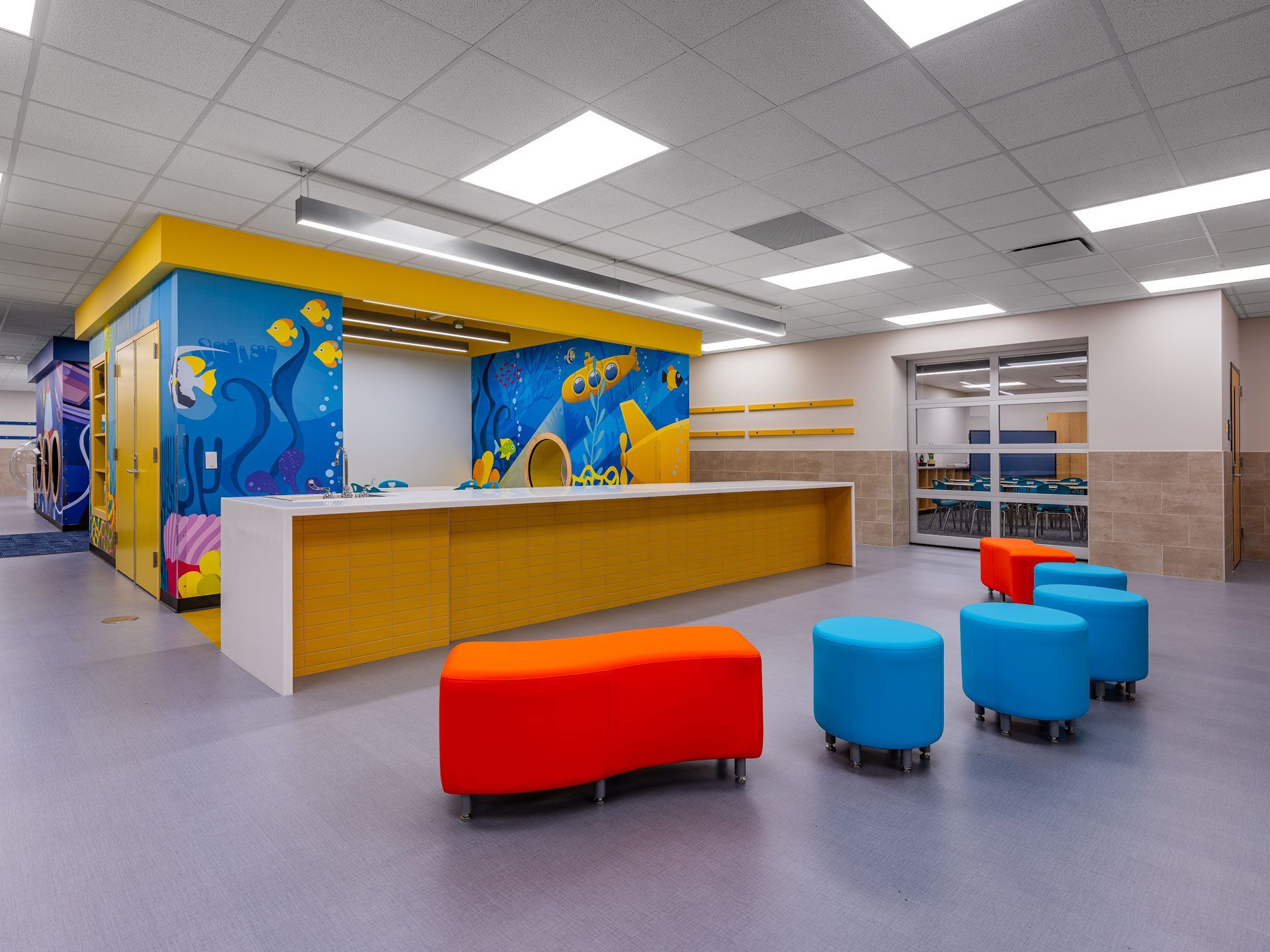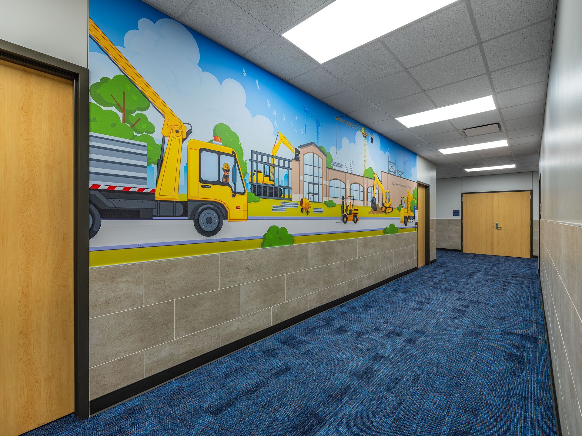 Northampton Elementary School underwent a comprehensive 80,200-SF renovation and addition project. Seventy-five percent of the existing building was gutted, leaving only the exterior walls and structure, to create more classroom space and modern learning environments. A new 3,500-SF fine arts section was added, enhancing the school and providing connectivity between the existing campus and the detached gymnasium. The renovation included a new fire sprinkler system, IT cabling, security systems, and a public address system across the entire campus. Windows were added to the exterior, allowing natural light into all exterior classrooms. One of the highlights is the creation of learning pods, surrounded by classrooms for each grade level, each featuring its own transportation theme. Teachers can open their classrooms with glass overhead doors hidden in the ceiling, creating an open-concept space for collaborative learning. Students can use the pods for classwork, reading, and experiments. The playground was upgraded with a new detention pond and a concrete walking trail. The existing parking lot was resurfaced and expanded, providing more parking spaces for teachers and a larger drop-off/pick-up line.